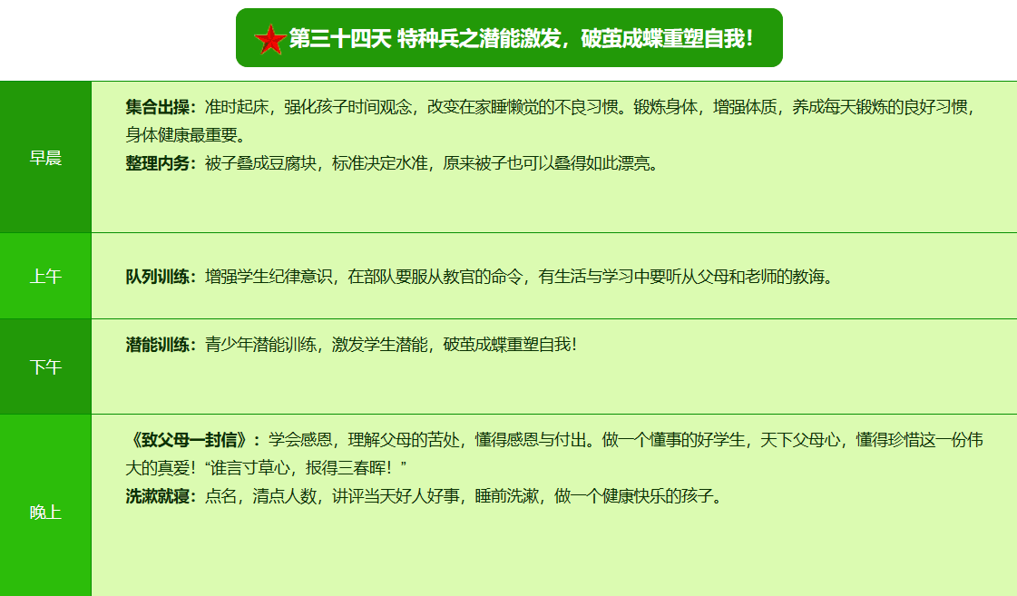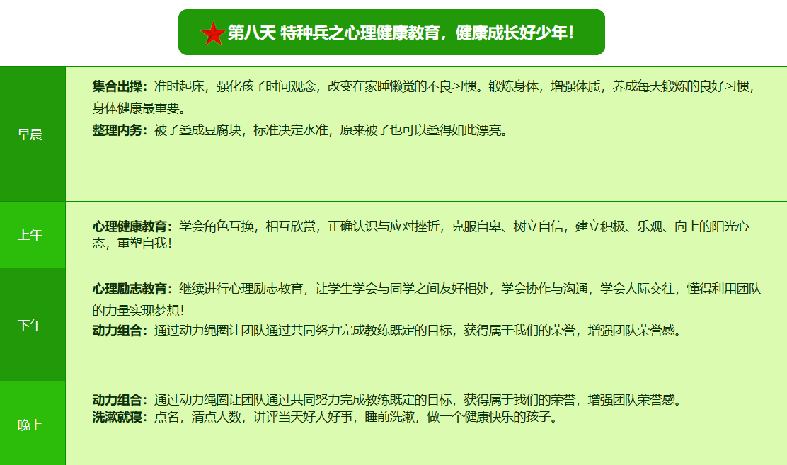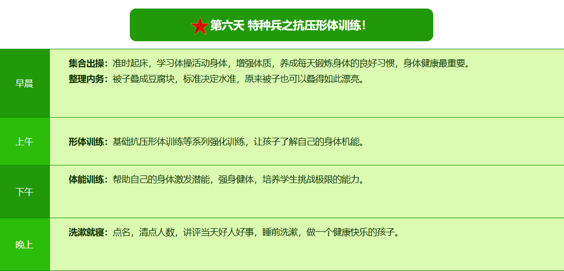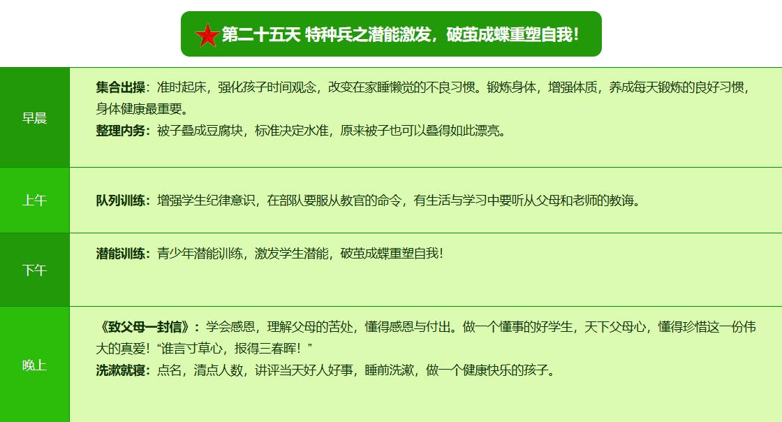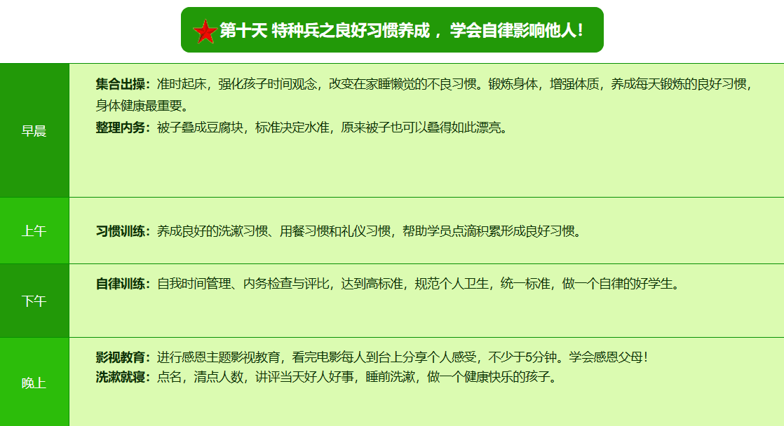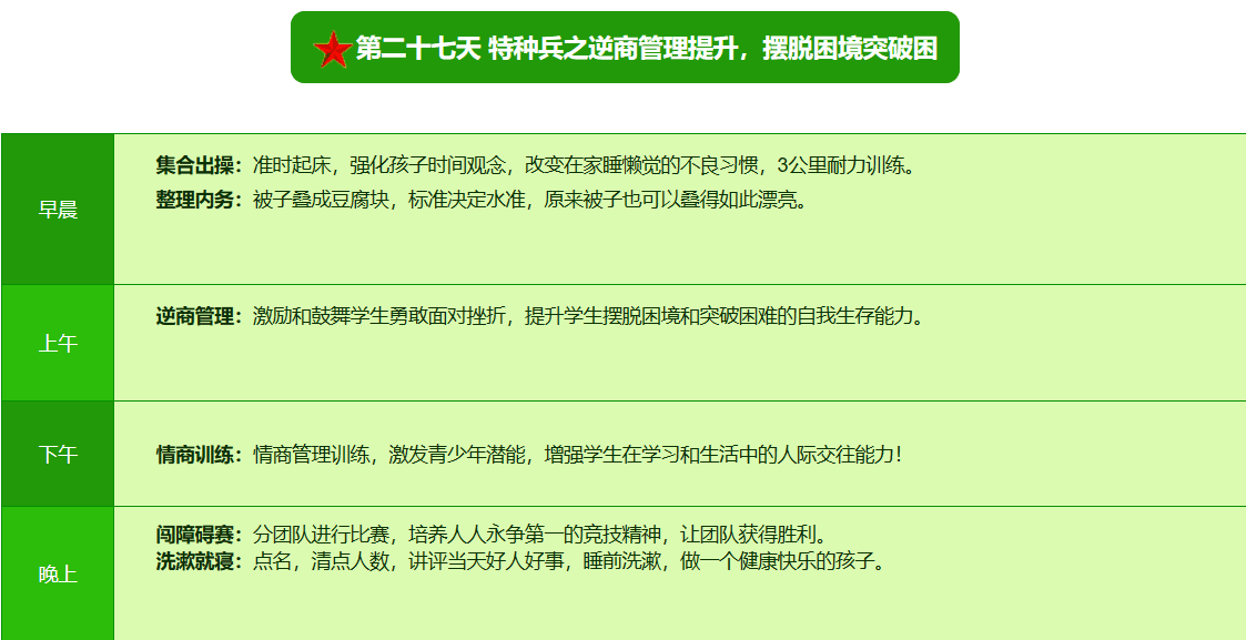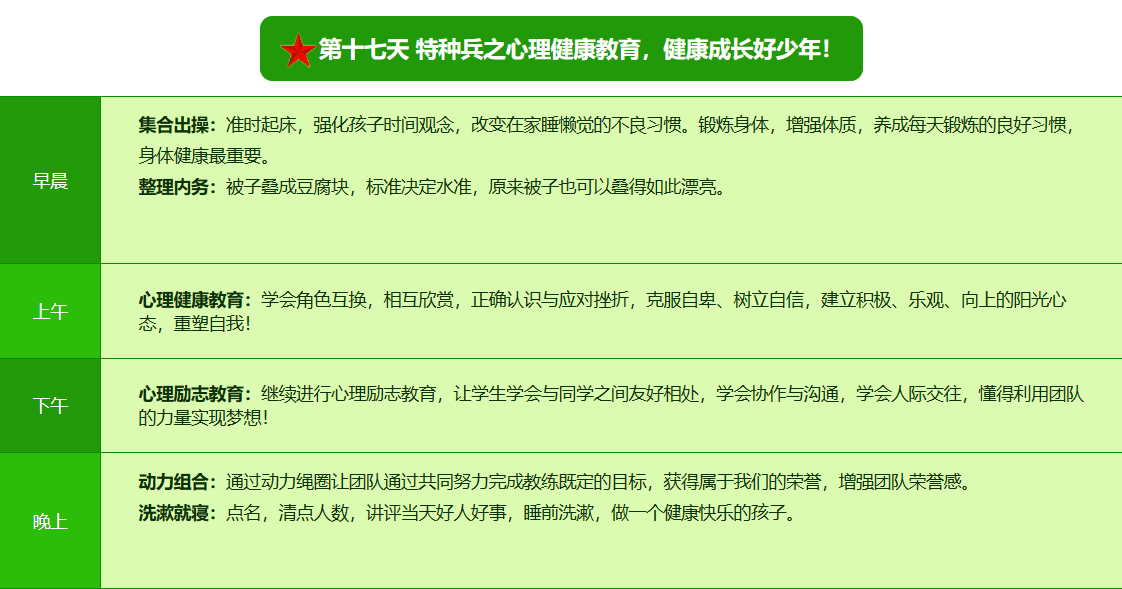 先进的特训理念:激发孩子改变和成长的核心问题是帮助孩子树立正确的人生观,价值观和学习观:让孩子明白真正学习目的,人生责任和追求目标、启发感恩之心,明白爱的真谛:树立积极心态和自信,创造自己生命的辉煌。
