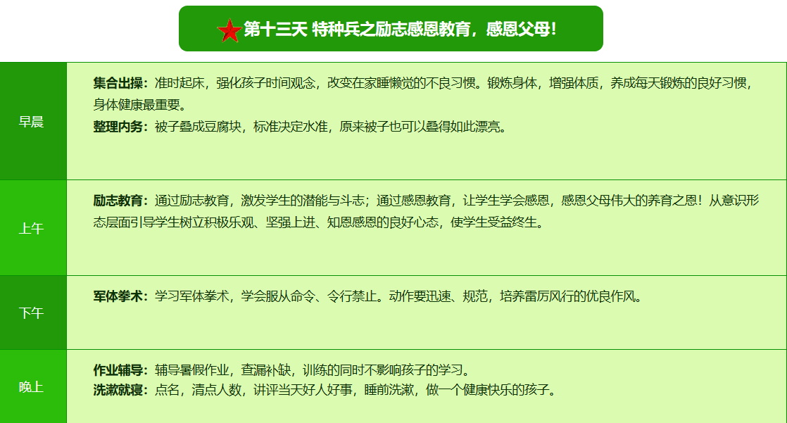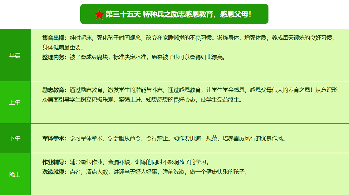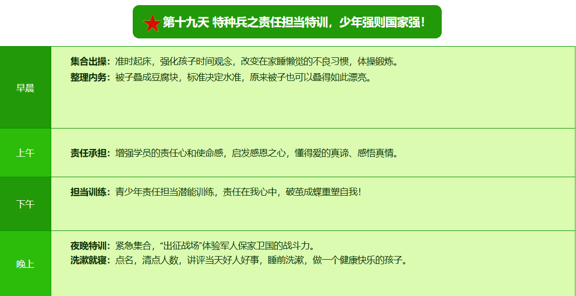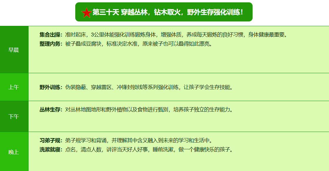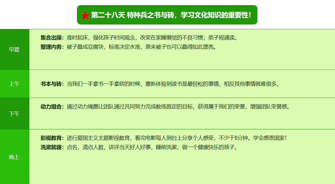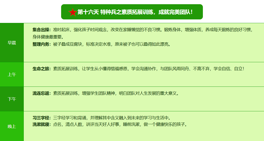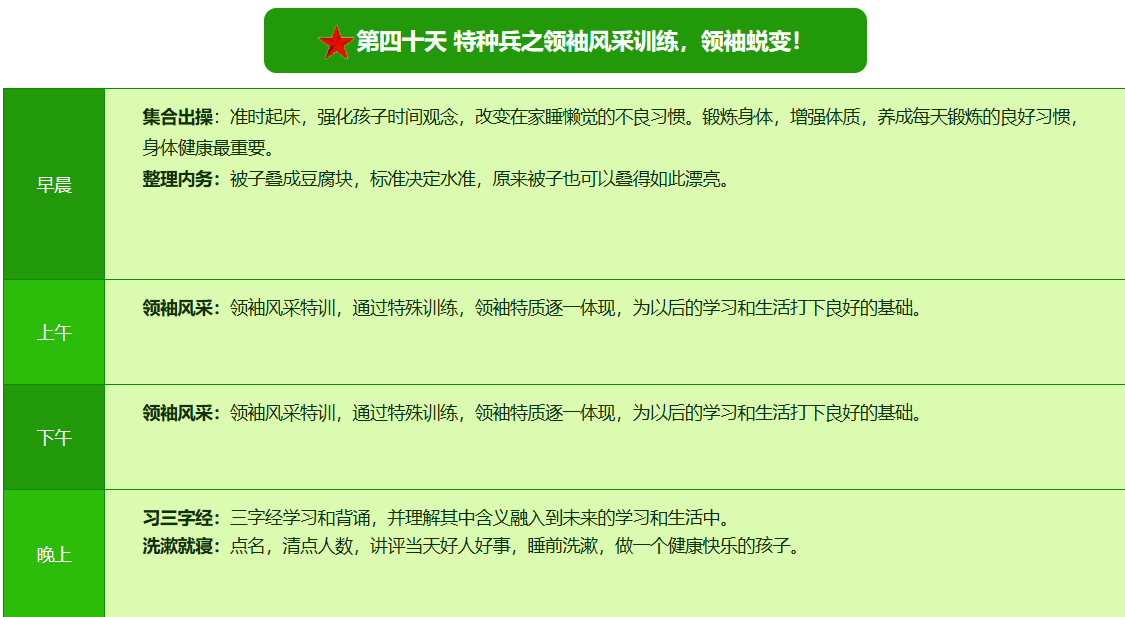 先进的特训理念:激发孩子改变和成长的核心问题是帮助孩子树立正确的人生观,价值观和学习观:让孩子明白真正学习目的,人生责任和追求目标、启发感恩之心,明白爱的真谛:树立积极心态和自信,创造自己生命的辉煌。